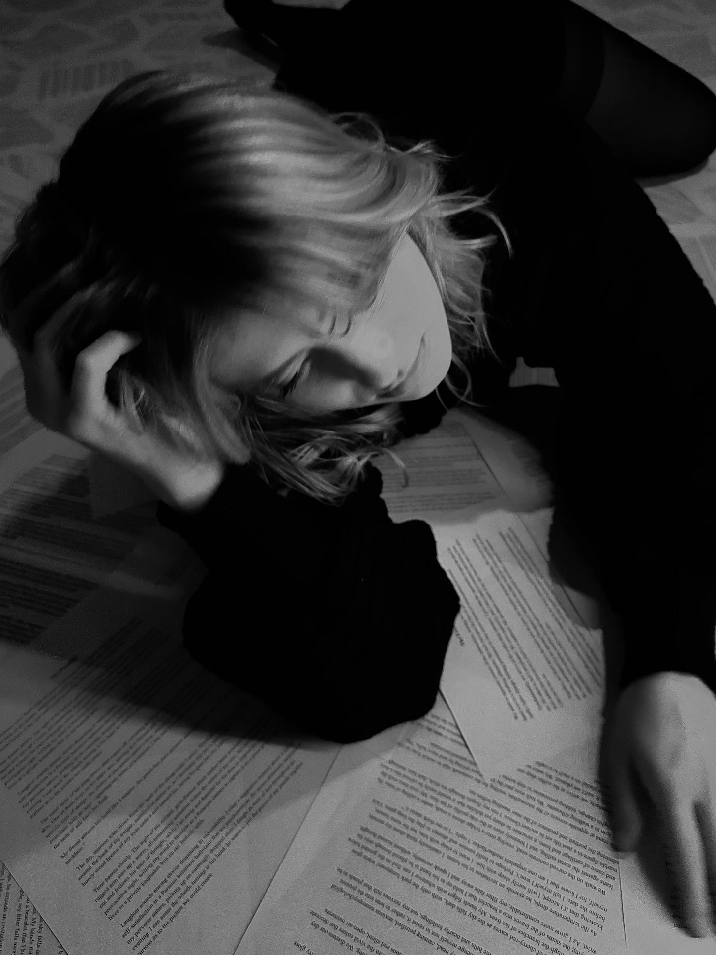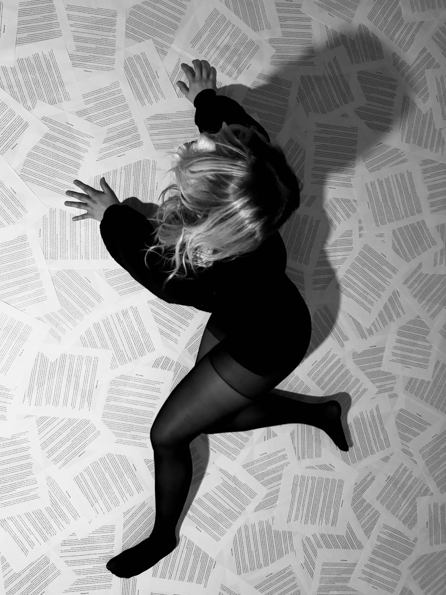 I printed out two hundred copies of the 3 pages I had written and meticulously taped down all four corners onto the floor of my studio apartment. My friend came over and took some photos of me. I like how they came out.